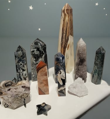 At The Crystal Butterfly, we offer a stunning selection of crystals including clusters, spheres, towers, and unique jewelry pieces. About 90% of the jewelry is hand-made by us.